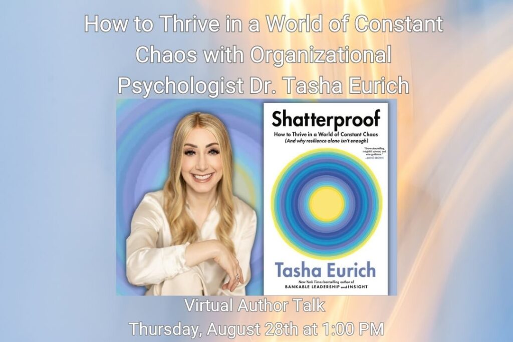 Learn how to master the daily grind and become shatterproof in a tumultuous world with key insights by Dr. Tasha Eurich as she talks about her newest book, Shatterproof: How to Thrive in a World of Constant Chaos (And why resilience alone isn’t enough). Join us Thursday, August 28th at 1pm for this virtual author talk. Register here for this free event.